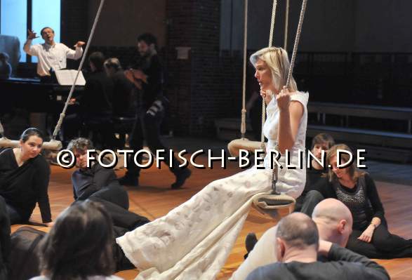 Ort: Radialsystem V. , Rundfunkchor Berlin. Titel: human requiem. Premiere: 11.02.2012. Szenische Einrichtung: Jochen Sandig. Dirigent: Simon Halsey. Licht: Joerg Bittner, Thomas Herda Im Bild: Rundfunkchor Berlin, Marlis Petersen (mi)