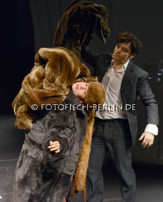 Ort: Deutsche Oper Berlin, ehemalige Tischlerei. Titel: MAHLERMANIA. Eine Produktion der Deutschen Oper Berlin in Kooperation mit Nico and the Navigators. Eroeffnung der neuen Buehne und Urauffuehrung am 27.11.2012 Musikalische Leitung: Moritz Gnann. Regie: Nicola Huempel. Buehne: Oliver Proske. Kostueme: Frauke Ritter. Von und mit: Ioannis Avakoumidis, Annedore Kleist, Anna-Luise Recke, Patric Schott, Frank Willens, Katarina Bradic, Simon Pauly. Im Bild: Anna-Luise Recke, Patric Schott
