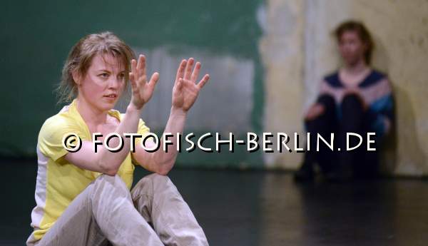 Ort: Sophiensaele. Tanztage Berlin 2013. 4.-14.1.2013. Antje Velsinger. Titel: AND THE BOAT GOES BACKWARDS. Premiere: 4.1.13 Konzept, Choreografie: Antje Verlsinger. Von und mit: Antje Velsinger, Lea Martini. Musik: Boris Hegenbart. Kostueme: Julia Laube Im Bild: Lea Martini, Antje Velsinger