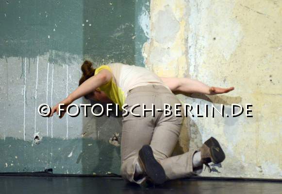 Ort: Sophiensaele. Tanztage Berlin 2013. 4.-14.1.2013. Antje Velsinger. Titel: AND THE BOAT GOES BACKWARDS. Premiere: 4.1.13 Konzept, Choreografie: Antje Verlsinger. Von und mit: Antje Velsinger, Lea Martini. Musik: Boris Hegenbart. Kostueme: Julia Laube Im Bild: Lea Martini