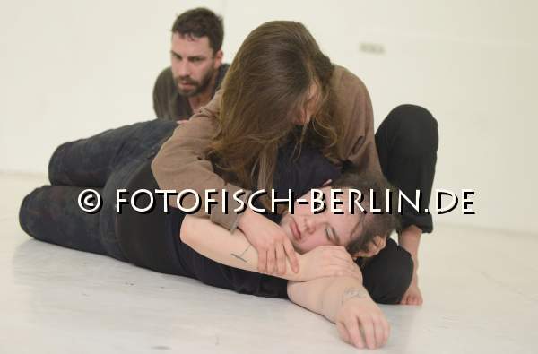 Ort: Sophiensaele. Premiere: 7.2.2013 Angela Schubot, Jared Gradinger, Aleesa Cohene Titel: LES PETITES MORTS_ALL MY HOLES ARE THEIRS Choreografie, Performance: Aleesa Cohene, Jared Gradinger, Angela Schubot. Musik: Tian Rotteveel. Licht: Andreas Harder. Im Bild: Angela Schubot, Jared Gradinger, Aleesa Cohene