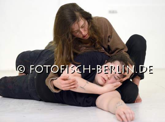 Ort: Sophiensaele. Premiere: 7.2.2013 Angela Schubot, Jared Gradinger, Aleesa Cohene Titel: LES PETITES MORTS_ALL MY HOLES ARE THEIRS Choreografie, Performance: Aleesa Cohene, Jared Gradinger, Angela Schubot. Musik: Tian Rotteveel. Licht: Andreas Harder. Im Bild: Angela Schubot, Jared Gradinger, Aleesa Cohene