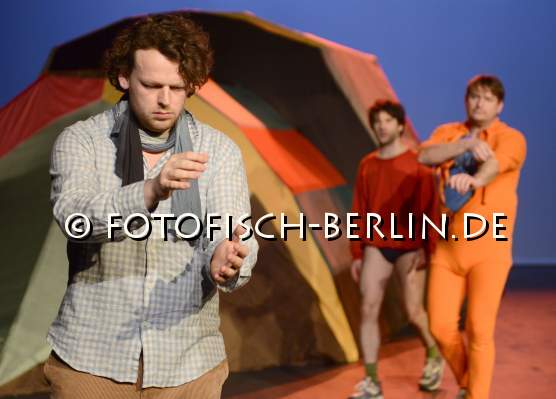 Ort: Hebbel am Ufer, hau3. Premiere: 28.02.2013 Martin Clausen und Kollegen. Titel: Don´t hope Konzept: Martin Clausen. Licht: Benjamin Schaelike. Kostueme: Anna-Lisa Kentner, Malena Modeer. Von und mit: Martin Clausen, Johannes Dulin, Johannes Hock, Peter Trabner, Doc Schoki, Mario Schulte, Harald Wissler. Im Bild: Peter Trabner, Martin Clausen, Johannes Dulin