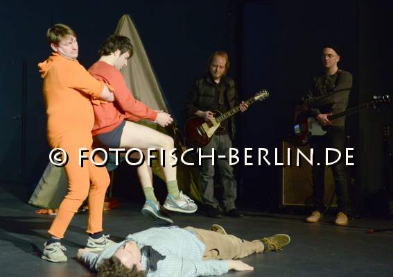Ort: Hebbel am Ufer, hau3. Premiere: 28.02.2013 Martin Clausen und Kollegen. Titel: Don´t hope Konzept: Martin Clausen. Licht: Benjamin Schaelike. Kostueme: Anna-Lisa Kentner, Malena Modeer. Von und mit: Martin Clausen, Johannes Dulin, Johannes Hock, Peter Trabner, Doc Schoki, Mario Schulte, Harald Wissler. Im Bild: Peter Trabner, Martin Clausen, Johannes Dulin