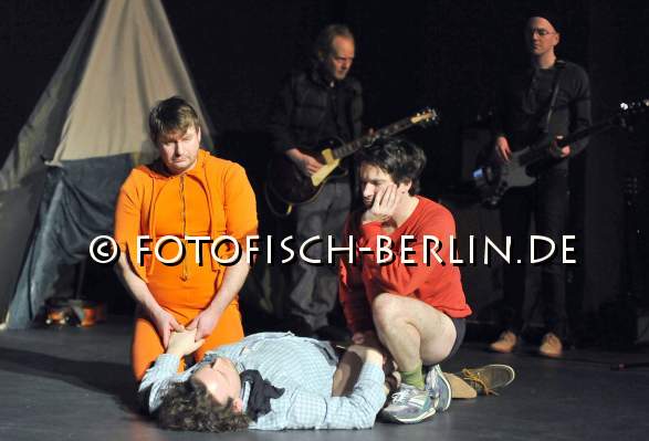 Ort: Hebbel am Ufer, hau3. Premiere: 28.02.2013 Martin Clausen und Kollegen. Titel: Don´t hope Konzept: Martin Clausen. Licht: Benjamin Schaelike. Kostueme: Anna-Lisa Kentner, Malena Modeer. Von und mit: Martin Clausen, Johannes Dulin, Johannes Hock, Peter Trabner, Doc Schoki, Mario Schulte, Harald Wissler. Im Bild: Peter Trabner, Martin Clausen, Johannes Dulin