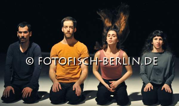 Ort: Ballhaus Naunynstrasse. Titel: I LOVE I _Ein Tanzstueck von Modjgan Hashemian. Premiere: 06.03.2013 Choreografie: Modjgan Hashemian. Buehne, Kostueme: Shira Wachsmann. Licht: Asier Solana. Tanz: Shiran Eliaserov, Kaveh Ghaemi, Michael Shapira, Maryam Zaree Im Bild: Kaveh Ghaemi, Maryam Zaree, Michael Shapira, Shiran Eliaserov