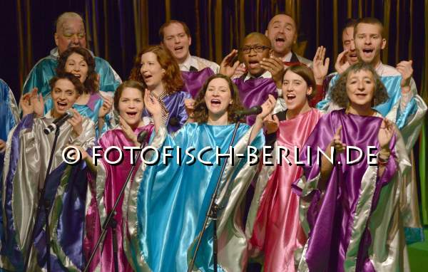 Ort: Sophiensaele. Bernadette La Hengst. Titel: BEDINGUNGSLOSES GRUNDEINSINGEN. Premiere: 28.03.2013. Kuenstlerische Leitung, Musik, Gesang: Bernadette La Hengst, Godehard Giese, Bettina Grahs, Claudia Wiedemer und Chor. Buehne, Kostueme: Jelka Plate, Eike Boettcher. Im Bild: Chor