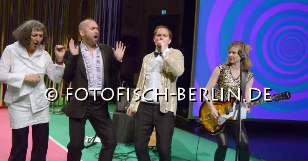 Ort: Sophiensaele. Bernadette La Hengst. Titel: BEDINGUNGSLOSES GRUNDEINSINGEN. Premiere: 28.03.2013. Kuenstlerische Leitung, Musik, Gesang: Bernadette La Hengst, Godehard Giese, Bettina Grahs, Claudia Wiedemer und Chor. Buehne, Kostueme: Jelka Plate, Eike Boettcher.