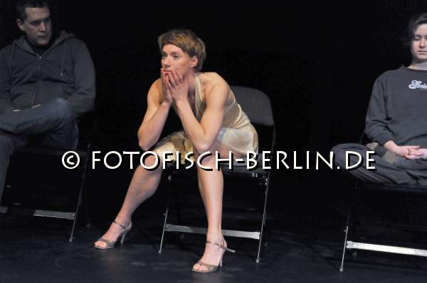 Ort: Sophiensaele. LUCKY TRIMMER_Tanz Performance Serie. 05.+06.04.2013 Angelika Thiele, Murielle Elizeon. Titel: Waiting for Pablo. Choreografie, Performance: Angelika Thiele, Murielle Elizeon. Kostuem, Licht: Sarah Marguier. Premiere. Im Bild: Angelika Thiele