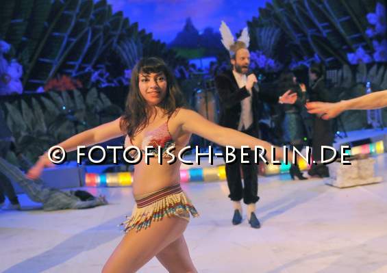 Ort: Hebbel am Ufer, hau 2. Santiago Blaum Titel: NIETZSCHE CONTRA WAGNER - Nueva Germania Opera Tropical. Premiere: 19.04.2013 Inszenierung, Musik: Santiago Blaum. Licht: Benny Hauser. Von und mit: Eva Loebau, Tatiana Sahphir, Jessica Gadani, Sebastian Arranz, Elly Fujita, Tamara Saphir, Jan Sebastian Suba, Rahel Savoldelli und Band. Im Bild: Tamara Saphir (li), Jan Sebastian Suba
