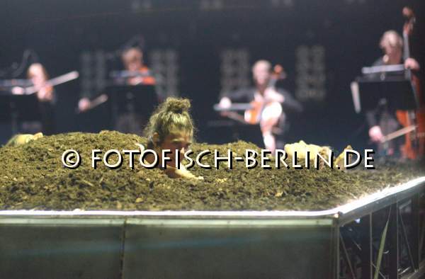 Ort: Hebbel am Ufer, hau 1. Ben Frost. Titel: THE WASP FACTORY. Based on the novel of the same name by Iain Banks. 26.-28.9.2013. Regie: Ben Frost. Musik: Streichquintett der Reykjavik Sinfonia. Buehne : Mirella Weingarten. Kostueme: Boris Bidjan Saberi. Licht: Lucy Carter. Mit: Lieselot De Wilde, Joerdis Richter, Mariam Wallentin und Reykjavik Sinfonia. Im Bild: Lieselot De Wilde