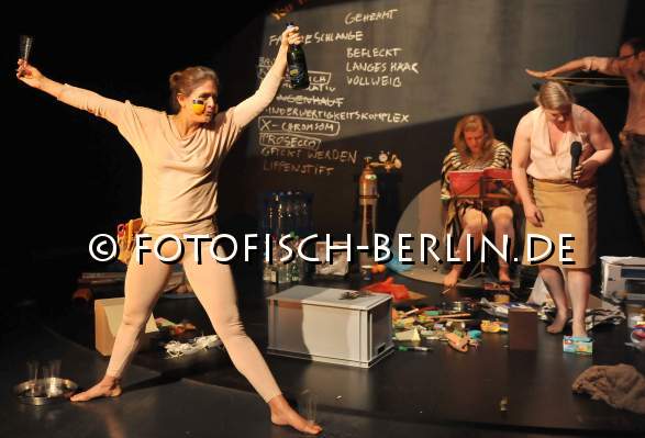 Ort: Hebbel am Ufer, hau 3. SHE SHE POP Titel: ENDE. Premiere: 8.10.2013. Konzept: She She Pop. Von und mit: Sebastian Bark (Adam), Lisa Lucassen (Engel), Mieke Matzke (Gott), Ilia Papatheodorou (Eva). Buehne, Kostuem: Sandra Fox, SSP. Im Bild: She She Pop, Ilia Papatheodorou (Eva)