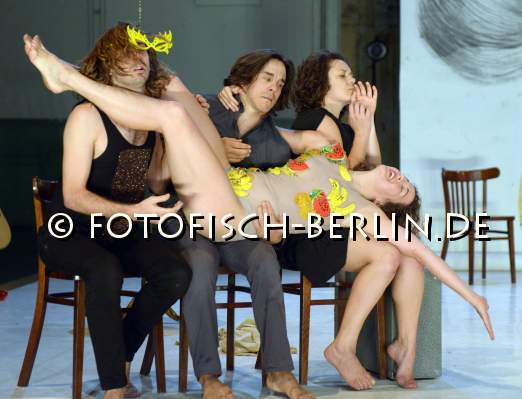 Ort: Sophiensaele. Nir de Volff_Total Brutal. Titel: DIARY OF A LOST DECADE. Premiere: 17.10.2013. Konzept, Regie: Nir de Volff. Musik: Claus Erbskorn. Buehne: Roey Heifetz. Kostueme: Iva Wili. Licht: Felix Grimm. Performance: Florian Bilbao, Claus Erbskorn, Natalia Fernandes, Katharina Maschenka Horn, Chris Scherer, Arie Oshri. Im Bild: Florian Bilbao, Natalia Fernandes, Katharina Maschenka Horn, Chris Scherer