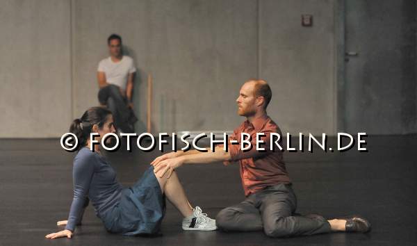 Ort: Radialsystem V, Berlin Hanna Hegenscheidt Titel: Lieb sein Urauffuehrung: 21.8.2009 Konzept und Choreogrphie: Hanna Hegenscheidt Licht: Benjamin Schaelike Ausstattung: Annette Goedde Von und mit: Niels Bormann, Chris Daftsios, Angharad Davies Foto: Angharad Davies, Chris Daftsios. Niels Bormann (v.l.n.re)