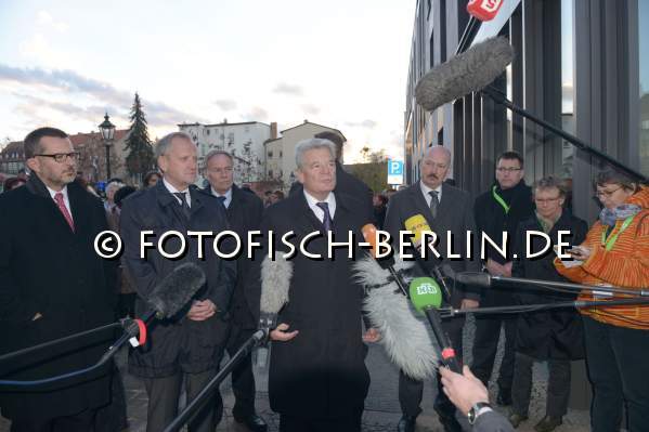 Ort: Eberswalde. 9. November 2013. Jahrestag zur Erinnerung an die Pogromnacht 1938. Bundespraesident Gauck weiht in Eberswalde (Barnim) das Denkmal "Wachsen mit Erinnerung" ein.
