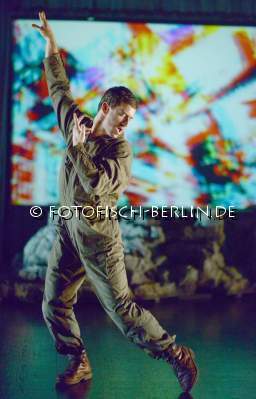 Ort: Sophiensaele. Santiago Blaum. Titel: Die Geschichte vom Soldaten Elik. Premiere: 31.01.2014 . Inszenierung: Santiago Blaum. Choreografie: Johanna Lemke. Musik: Joe Howe, Santiago Blaum. Buehne, Kostueme: Cristina Nyffeler. Licht: Benjamin Schaelike. Von und mit: Elik Niv, Johanna Lemke, Tatiana Saphir, Eva Loebau. Im Bild: Elik Niv