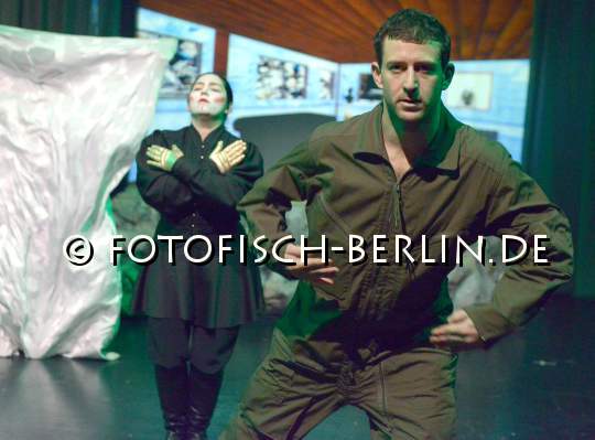 Ort: Sophiensaele. Santiago Blaum. Titel: Die Geschichte vom Soldaten Elik. Premiere: 31.01.2014 . Inszenierung: Santiago Blaum. Choreografie: Johanna Lemke. Musik: Joe Howe, Santiago Blaum. Buehne, Kostueme: Cristina Nyffeler. Licht: Benjamin Schaelike. Von und mit: Elik Niv, Johanna Lemke, Tatiana Saphir, Eva Loebau. Im Bild: Elik Niv, Tatiana Saphir