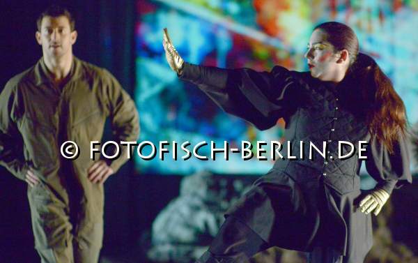 Ort: Sophiensaele. Santiago Blaum. Titel: Die Geschichte vom Soldaten Elik. Premiere: 31.01.2014 . Inszenierung: Santiago Blaum. Choreografie: Johanna Lemke. Musik: Joe Howe, Santiago Blaum. Buehne, Kostueme: Cristina Nyffeler. Licht: Benjamin Schaelike. Von und mit: Elik Niv, Johanna Lemke, Tatiana Saphir, Eva Loebau. Im Bild: Elik Niv, Tatiana Saphir