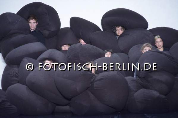 Ort: Uferstudios. Isabelle Schad. Titel: DER BAU - Gruppe 12x60. Premiere: 6.2.2014. Konzept, Choreografie: Isabelle Schad. Kuenstlerische Zusammenarbeit: Sasa Bozic, Laurent Goldring. Lichtdesign: Mehdi Toutain-Lopez. Sound: Marcello Busato. Kostueme: Marion Montel. Tanz / Performance: Ivaylo Dimitrov, Hana Erdman, Jasmin Ihrac, Przemyslaw Kaminski, Roni Katz, Nina Kurtela, Diethild Meier, Lea Moro, Benjamin Pohlig, David Pollmann, Anna Posch, Sonja Pregrad Im Bild: Szenenfoto_Der Bau_Gruppe 12x60