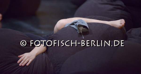 Ort: Uferstudios. Isabelle Schad. Titel: DER BAU - Gruppe 12x60. Premiere: 6.2.2014. Konzept, Choreografie: Isabelle Schad. Kuenstlerische Zusammenarbeit: Sasa Bozic, Laurent Goldring. Lichtdesign: Mehdi Toutain-Lopez. Sound: Marcello Busato. Kostueme: Marion Montel. Tanz / Performance: Ivaylo Dimitrov, Hana Erdman, Jasmin Ihrac, Przemyslaw Kaminski, Roni Katz, Nina Kurtela, Diethild Meier, Lea Moro, Benjamin Pohlig, David Pollmann, Anna Posch, Sonja Pregrad Im Bild: Szenenfoto_Der Bau_Gruppe 12x60