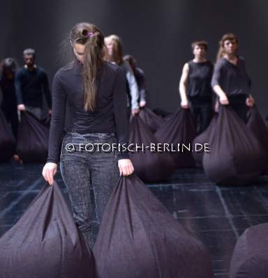 Ort: Uferstudios. Isabelle Schad. Titel: DER BAU - Gruppe 12x60. Premiere: 6.2.2014. Konzept, Choreografie: Isabelle Schad. Kuenstlerische Zusammenarbeit: Sasa Bozic, Laurent Goldring. Lichtdesign: Mehdi Toutain-Lopez. Sound: Marcello Busato. Kostueme: Marion Montel. Tanz / Performance: Ivaylo Dimitrov, Hana Erdman, Jasmin Ihrac, Przemyslaw Kaminski, Roni Katz, Nina Kurtela, Diethild Meier, Lea Moro, Benjamin Pohlig, David Pollmann, Anna Posch, Sonja Pregrad Im Bild: Szenenfoto_Der Bau_Gruppe 12x60