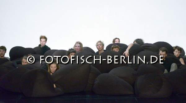 Ort: Uferstudios. Isabelle Schad. Titel: DER BAU - Gruppe 12x60. Premiere: 6.2.2014. Konzept, Choreografie: Isabelle Schad. Kuenstlerische Zusammenarbeit: Sasa Bozic, Laurent Goldring. Lichtdesign: Mehdi Toutain-Lopez. Sound: Marcello Busato. Kostueme: Marion Montel. Tanz / Performance: Ivaylo Dimitrov, Hana Erdman, Jasmin Ihrac, Przemyslaw Kaminski, Roni Katz, Nina Kurtela, Diethild Meier, Lea Moro, Benjamin Pohlig, David Pollmann, Anna Posch, Sonja Pregrad Im Bild: Szenenfoto_Der Bau_Gruppe 12x60