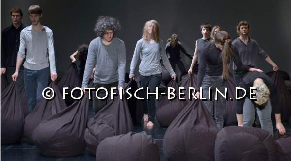 Ort: Uferstudios. Isabelle Schad. Titel: DER BAU - Gruppe 12x60. Premiere: 6.2.2014. Konzept, Choreografie: Isabelle Schad. Kuenstlerische Zusammenarbeit: Sasa Bozic, Laurent Goldring. Lichtdesign: Mehdi Toutain-Lopez. Sound: Marcello Busato. Kostueme: Marion Montel. Tanz / Performance: Ivaylo Dimitrov, Hana Erdman, Jasmin Ihrac, Przemyslaw Kaminski, Roni Katz, Nina Kurtela, Diethild Meier, Lea Moro, Benjamin Pohlig, David Pollmann, Anna Posch, Sonja Pregrad Im Bild: Szenenfoto_Der Bau_Gruppe 12x60