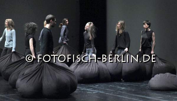 Ort: Uferstudios. Isabelle Schad. Titel: DER BAU - Gruppe 12x60. Premiere: 6.2.2014. Konzept, Choreografie: Isabelle Schad. Kuenstlerische Zusammenarbeit: Sasa Bozic, Laurent Goldring. Lichtdesign: Mehdi Toutain-Lopez. Sound: Marcello Busato. Kostueme: Marion Montel. Tanz / Performance: Ivaylo Dimitrov, Hana Erdman, Jasmin Ihrac, Przemyslaw Kaminski, Roni Katz, Nina Kurtela, Diethild Meier, Lea Moro, Benjamin Pohlig, David Pollmann, Anna Posch, Sonja Pregrad Im Bild: Szenenfoto_Der Bau_Gruppe 12x60