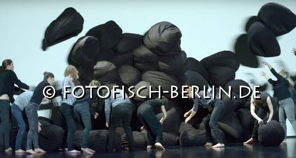 Ort: Uferstudios. Isabelle Schad. Titel: DER BAU - Gruppe 12x60. Premiere: 6.2.2014. Konzept, Choreografie: Isabelle Schad. Kuenstlerische Zusammenarbeit: Sasa Bozic, Laurent Goldring. Lichtdesign: Mehdi Toutain-Lopez. Sound: Marcello Busato. Kostueme: Marion Montel. Tanz / Performance: Ivaylo Dimitrov, Hana Erdman, Jasmin Ihrac, Przemyslaw Kaminski, Roni Katz, Nina Kurtela, Diethild Meier, Lea Moro, Benjamin Pohlig, David Pollmann, Anna Posch, Sonja Pregrad Im Bild: Szenenfoto_Der Bau_Gruppe 12x60