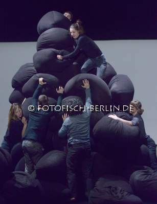 Ort: Uferstudios. Isabelle Schad. Titel: DER BAU - Gruppe 12x60. Premiere: 6.2.2014. Konzept, Choreografie: Isabelle Schad. Kuenstlerische Zusammenarbeit: Sasa Bozic, Laurent Goldring. Lichtdesign: Mehdi Toutain-Lopez. Sound: Marcello Busato. Kostueme: Marion Montel. Tanz / Performance: Ivaylo Dimitrov, Hana Erdman, Jasmin Ihrac, Przemyslaw Kaminski, Roni Katz, Nina Kurtela, Diethild Meier, Lea Moro, Benjamin Pohlig, David Pollmann, Anna Posch, Sonja Pregrad Im Bild: Szenenfoto_Der Bau_Gruppe 12x60