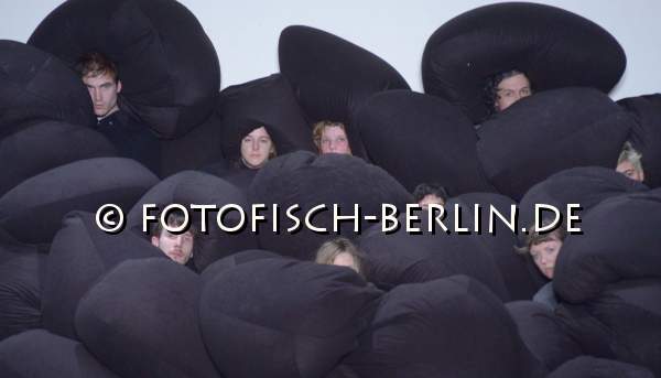 Ort: Uferstudios. Isabelle Schad. Titel: DER BAU - Gruppe 12x60. Premiere: 6.2.2014. Konzept, Choreografie: Isabelle Schad. Kuenstlerische Zusammenarbeit: Sasa Bozic, Laurent Goldring. Lichtdesign: Mehdi Toutain-Lopez. Sound: Marcello Busato. Kostueme: Marion Montel. Tanz / Performance: Ivaylo Dimitrov, Hana Erdman, Jasmin Ihrac, Przemyslaw Kaminski, Roni Katz, Nina Kurtela, Diethild Meier, Lea Moro, Benjamin Pohlig, David Pollmann, Anna Posch, Sonja Pregrad Im Bild: Szenenfoto_Der Bau_Gruppe 12x60
