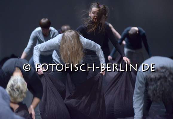 Ort: Uferstudios. Isabelle Schad. Titel: DER BAU - Gruppe 12x60. Premiere: 6.2.2014. Konzept, Choreografie: Isabelle Schad. Kuenstlerische Zusammenarbeit: Sasa Bozic, Laurent Goldring. Lichtdesign: Mehdi Toutain-Lopez. Sound: Marcello Busato. Kostueme: Marion Montel. Tanz / Performance: Ivaylo Dimitrov, Hana Erdman, Jasmin Ihrac, Przemyslaw Kaminski, Roni Katz, Nina Kurtela, Diethild Meier, Lea Moro, Benjamin Pohlig, David Pollmann, Anna Posch, Sonja Pregrad Im Bild: Szenenfoto_Der Bau_Gruppe 12x60