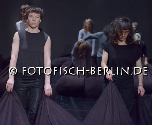 Ort: Uferstudios. Isabelle Schad. Titel: DER BAU - Gruppe 12x60. Premiere: 6.2.2014. Konzept, Choreografie: Isabelle Schad. Kuenstlerische Zusammenarbeit: Sasa Bozic, Laurent Goldring. Lichtdesign: Mehdi Toutain-Lopez. Sound: Marcello Busato. Kostueme: Marion Montel. Tanz / Performance: Ivaylo Dimitrov, Hana Erdman, Jasmin Ihrac, Przemyslaw Kaminski, Roni Katz, Nina Kurtela, Diethild Meier, Lea Moro, Benjamin Pohlig, David Pollmann, Anna Posch, Sonja Pregrad Im Bild: Szenenfoto_Der Bau_Gruppe 12x60