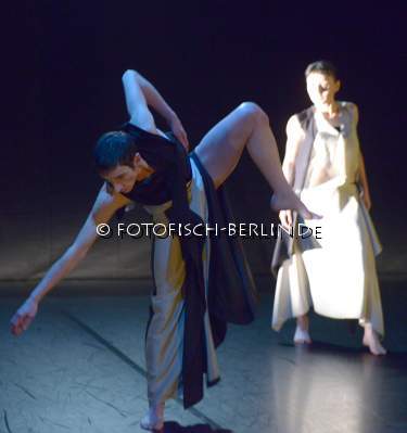 Ort: Studio laborgras. Titel: Retour (was waere wenn...) Ein Projekt von labrogras. Premiere: 27.02.2014. Idee, Choreografie: Renate Graziadei, Arthur Staeldi. Performance: Maria Giulia Serantoni, Renate Graziadei. Live Music: Phoebe Killdeer. Kostuem: Chantal Margiotta. Licht: Lutz Deppe. Im Bild: Maria Giulia Serantoni, Renate Graziadei