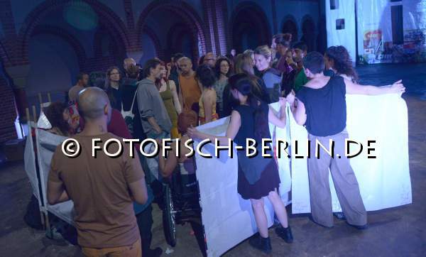 Ort: St. Johannes-Evangelist Kirche. DIN A 13 tanzcompany Titel: Tranz_flexion. Multimediale performative (Tanz)- Installation. Urauffuehrung: 16.04.2014. Choreografie: Gerda Koenig. Videokuenstler: Vishnu Vasu, Leon Grauer, Daniel Landau. Musik: Harsha Makalande, Xavier Losanda, Nimrod Gorovich. Kostueme: Nikita Deana, Juan Carlos Vivas, Rozi Canan. Licht: Gerd Weidig. Tanz: Ensemble DIN A 13 tanzcompany Im Bild: Ensemble DIN A 13 tanzcompany