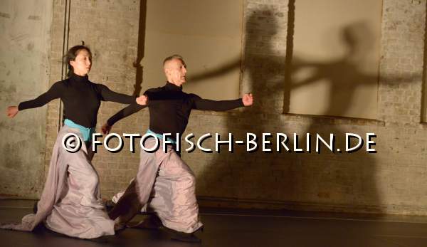 Ort: Dock 11. Tanzcompagnie Rubato. Titel: Two Figures in a Landscape. Doppelpremiere: 07.05.2014 Inszenierung, Choreografie: Jutta Hell Tanz, Choreografie: Li Ling Xi, Dieter Baumann. Kostuem, Skulptur: Jonathan Baldock. Licht: Jochen Massar. Im Bild: Li Ling Xi, Dieter Baumann