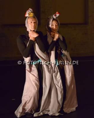 Ort: Dock 11. Tanzcompagnie Rubato. Titel: Two Figures in a Landscape. Doppelpremiere: 07.05.2014 Inszenierung, Choreografie: Jutta Hell Tanz, Choreografie: Li Ling Xi, Dieter Baumann. Kostuem, Skulptur: Jonathan Baldock. Licht: Jochen Massar. Im Bild: Li Ling Xi, Dieter Baumann