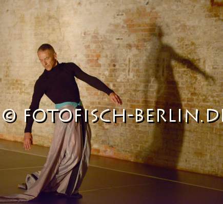 Ort: Dock 11. Tanzcompagnie Rubato. Titel: Two Figures in a Landscape. Doppelpremiere: 07.05.2014 Inszenierung, Choreografie: Jutta Hell Tanz, Choreografie: Li Ling Xi, Dieter Baumann. Kostuem, Skulptur: Jonathan Baldock. Licht: Jochen Massar. Im Bild: Dieter Baumann