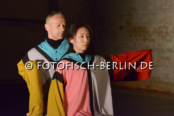 Ort: Dock 11. Tanzcompagnie Rubato. Titel: Two Figures in a Landscape. Doppelpremiere: 07.05.2014 Inszenierung, Choreografie: Jutta Hell Tanz, Choreografie: Li Ling Xi, Dieter Baumann. Kostuem, Skulptur: Jonathan Baldock. Licht: Jochen Massar. Im Bild: Li Ling Xi, Dieter Baumann