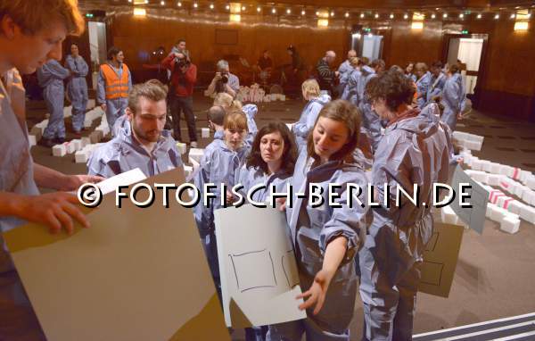 Ort: Hebbel am Ufer, hau 1. Invisible Playground & Andromeda Mega Express Orchestra. DROHNENMAERCHEN. Ein Spiel für 80 Menschen, 18 Musiker und echte Drohnen. Premiere: 15.5.2014 Konzeption, Game Design: Invisible Playground, Friedrich Kirschner. Game Polishing: Daniel Boy. Buehne, Kostueme: Anna Hentschel. Musik: Andromeda Mega Express Orchestra. Im Bild: Publikum in Aktion