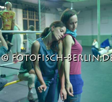 Ort: Sophiensaele . Sebastian Matthias. Titel: SYNEKISM_GROOVE SPACE. Premiere: 18.09.2014 Choreografie, Konzept: Sebastian Matthias. Sound: Tamer Fahri Oezgoenenc. Kostueme: Nina Irina Witkiewicz. Tanz: Jubal Battisti, Lisanne Goodhue, Kiriakos Hadjiioannou, Isac Spencer, Harumi Terayama, Idan Yoav, Deborah Hofstetter. Im Bild: Probe mit Zuschauern, Deborah Hofstetter