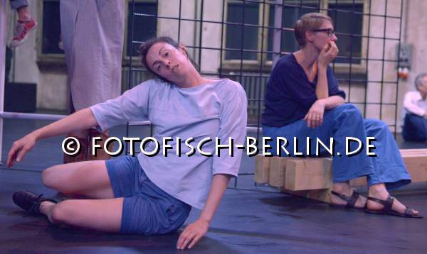 Ort: Sophiensaele . Sebastian Matthias. Titel: SYNEKISM_GROOVE SPACE. Premiere: 18.09.2014 Choreografie, Konzept: Sebastian Matthias. Sound: Tamer Fahri Oezgoenenc. Kostueme: Nina Irina Witkiewicz. Tanz: Jubal Battisti, Lisanne Goodhue, Kiriakos Hadjiioannou, Isac Spencer, Harumi Terayama, Idan Yoav, Deborah Hofstetter. Im Bild: Probe mit Zuschauern, Lisanne Goodhue (li)