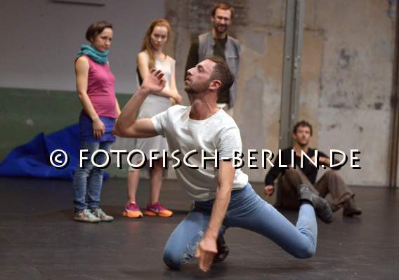 Ort: Sophiensaele . Sebastian Matthias. Titel: SYNEKISM_GROOVE SPACE. Premiere: 18.09.2014 Choreografie, Konzept: Sebastian Matthias. Sound: Tamer Fahri Oezgoenenc. Kostueme: Nina Irina Witkiewicz. Tanz: Jubal Battisti, Lisanne Goodhue, Kiriakos Hadjiioannou, Isac Spencer, Harumi Terayama, Idan Yoav, Deborah Hofstetter. Im Bild: Probe mit Zuschauern, Kiriakos Hadjiioannou