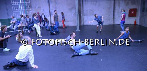 Ort: Sophiensaele . Sebastian Matthias. Titel: SYNEKISM_GROOVE SPACE. Premiere: 18.09.2014 Choreografie, Konzept: Sebastian Matthias. Sound: Tamer Fahri Oezgoenenc. Kostueme: Nina Irina Witkiewicz. Tanz: Jubal Battisti, Lisanne Goodhue, Kiriakos Hadjiioannou, Isac Spencer, Harumi Terayama, Idan Yoav, Deborah Hofstetter. Im Bild: Probe mit Zuschauern