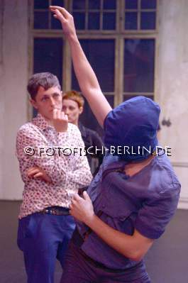 Ort: Sophiensaele . Sebastian Matthias. Titel: SYNEKISM_GROOVE SPACE. Premiere: 18.09.2014 Choreografie, Konzept: Sebastian Matthias. Sound: Tamer Fahri Oezgoenenc. Kostueme: Nina Irina Witkiewicz. Tanz: Jubal Battisti, Lisanne Goodhue, Kiriakos Hadjiioannou, Isac Spencer, Harumi Terayama, Idan Yoav, Deborah Hofstetter. Im Bild: Probe mit Zuschauern