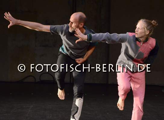 Ort: Sophiensaele. Martin Nachbar. Titel: THINGAMAJIG. Premiere: 02.10.2014. Kuenstlerische Leitung: Martin Nachbar. Musik: Boris Hauf. Kostueme: Marion Montel. Licht: Bruno Pocheron. Tanz, Choreografie: Philipp Enders, Coralie Meinquet, Benjamin Pohlig, Martin Nachbar (Jochen Roller), Sunniva Vikor Egenes. Im Bild: Coralie Meinquet, Martin Nachbar