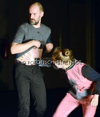 Ort: Sophiensaele. Martin Nachbar. Titel: THINGAMAJIG. Premiere: 02.10.2014. Kuenstlerische Leitung: Martin Nachbar. Musik: Boris Hauf. Kostueme: Marion Montel. Licht: Bruno Pocheron. Tanz, Choreografie: Philipp Enders, Coralie Meinquet, Benjamin Pohlig, Martin Nachbar (Jochen Roller), Sunniva Vikor Egenes. Im Bild: Coralie Meinquet, Martin Nachbar