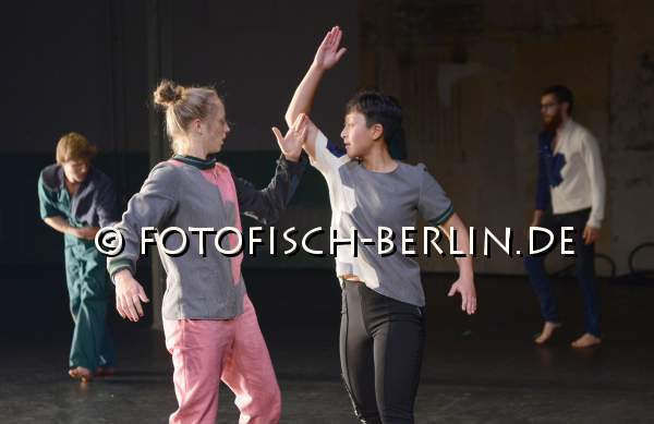 Ort: Sophiensaele. Martin Nachbar. Titel: THINGAMAJIG. Premiere: 02.10.2014. Kuenstlerische Leitung: Martin Nachbar. Musik: Boris Hauf. Kostueme: Marion Montel. Licht: Bruno Pocheron. Tanz, Choreografie: Philipp Enders, Coralie Meinquet, Benjamin Pohlig, Martin Nachbar (Jochen Roller), Sunniva Vikor Egenes. Im Bild: Ensemble