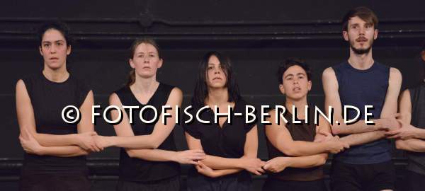 Ort: Hebbel am Ufer, hau 2. Isabelle Schad. Titel: COLLECTIVE JUMPS. Premiere: 28.11.2014 Konzept, Choreographie: Isabelle Schad, Laurent Goldring. Licht: Mehdi Toutain-Lopez. Kostueme: Lea Girod. Performance, Tanz: Juan Cobeis, Hana Erdman, Naima Ferre, Jasmin Ihrac, Przemyslaw Kaminski, Roni Katz, Mathis Kleinschnittger, Inna Krasnoper, Aoife McAtamney, Zwoisy Mears-Clarke, Lea Moro, Benjamin Pohlig, Julia Rodriguez, Claudia Tomasi, Nir Vidan, Sunniva Vikor Egenes. Im Bild: Ensemble