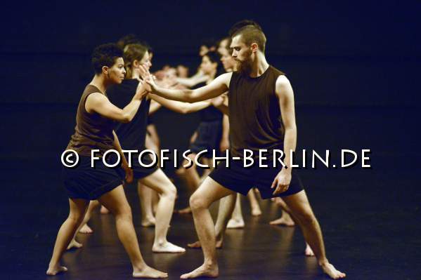 Ort: Hebbel am Ufer, hau 2. Isabelle Schad. Titel: COLLECTIVE JUMPS. Premiere: 28.11.2014 Konzept, Choreographie: Isabelle Schad, Laurent Goldring. Licht: Mehdi Toutain-Lopez. Kostueme: Lea Girod. Performance, Tanz: Juan Cobeis, Hana Erdman, Naima Ferre, Jasmin Ihrac, Przemyslaw Kaminski, Roni Katz, Mathis Kleinschnittger, Inna Krasnoper, Aoife McAtamney, Zwoisy Mears-Clarke, Lea Moro, Benjamin Pohlig, Julia Rodriguez, Claudia Tomasi, Nir Vidan, Sunniva Vikor Egenes. Im Bild: Ensemble